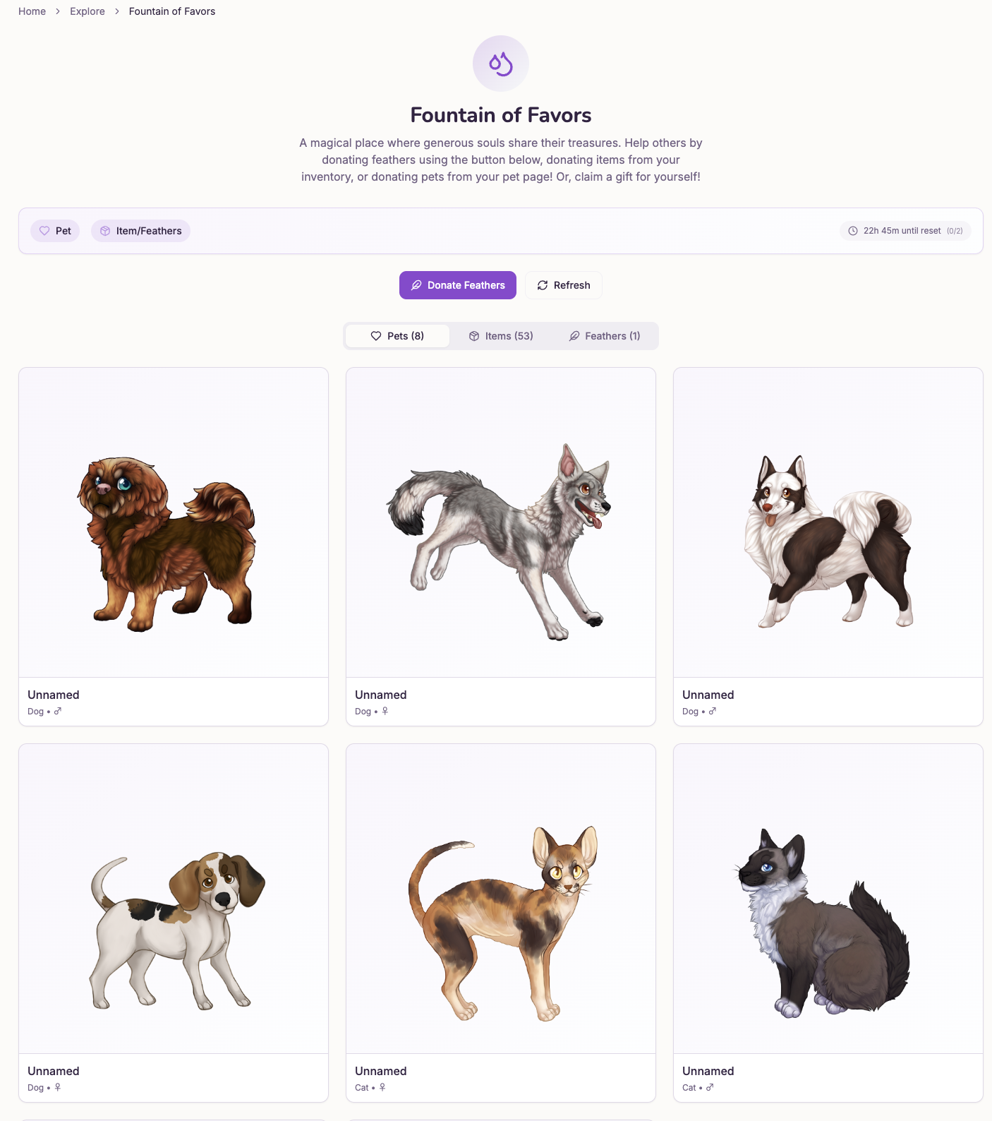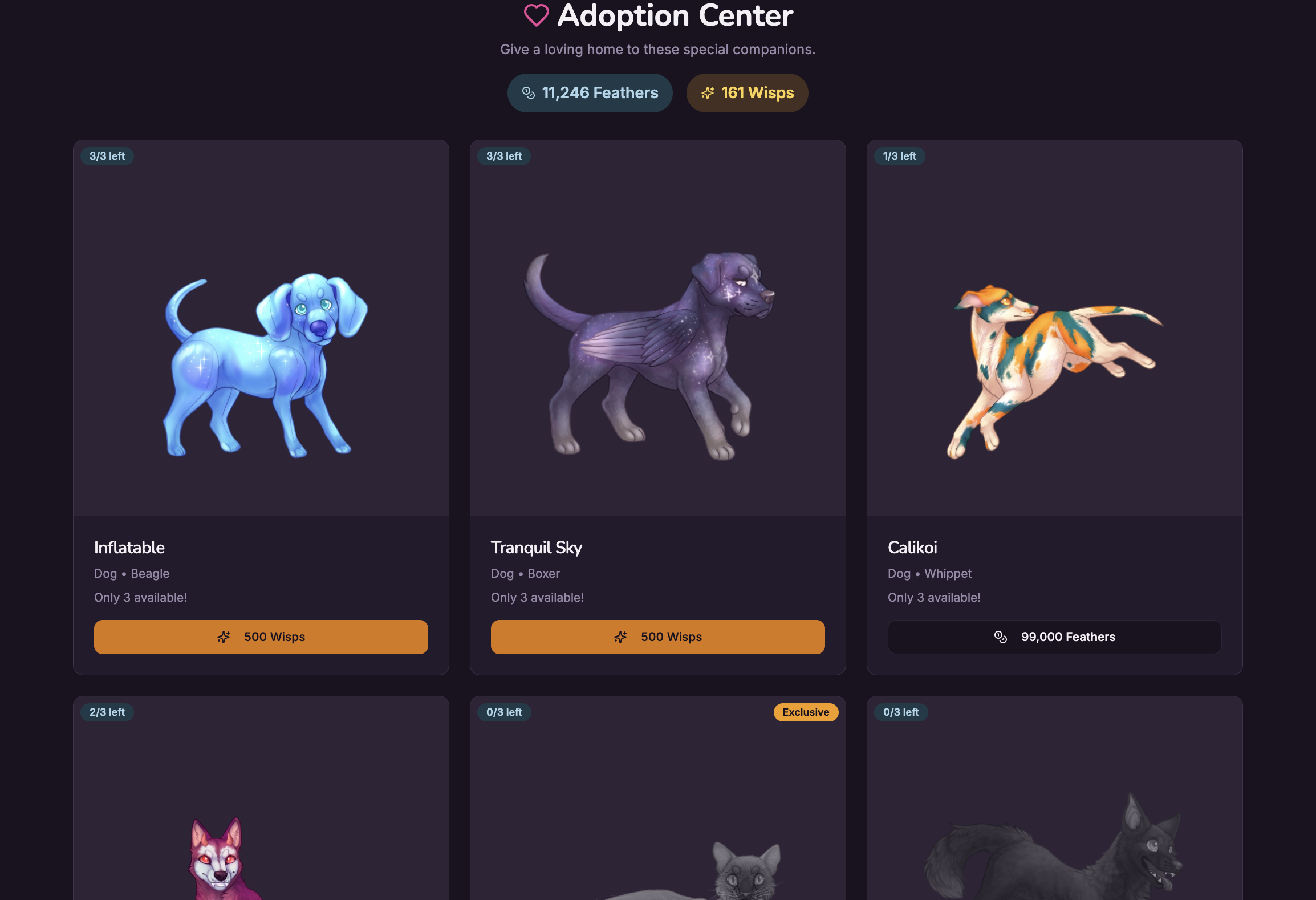 2) The point of the game was not pet collection en masse, but to love and cherish the pets you have. But to address this we have stated that we plan to have the premium currency be earnable without paying out to us, and for users to be able to trade the currency just like other pet sites, and we also plan on having an adoption center with pets available for the non-premium currency as well! The cost for the breeding/customs is because each breeding and custom is hand drawn by our artists to give each pet a unique flair.